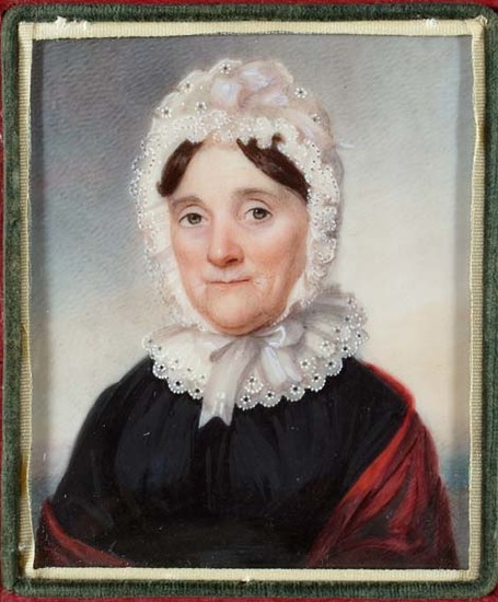 Bust portrait of older woman facing front left. Light blue background. Woman is wearing dark dress with scarlet shawl, white lace bonnet. She has brown hair, green eyes. Plain red leather case with 2 hooks. White silk lining with green leather binder, white ribbon.