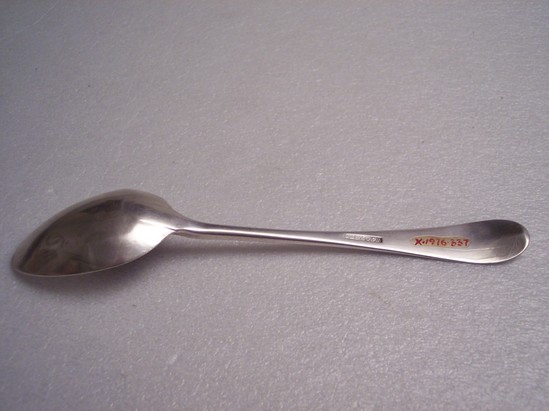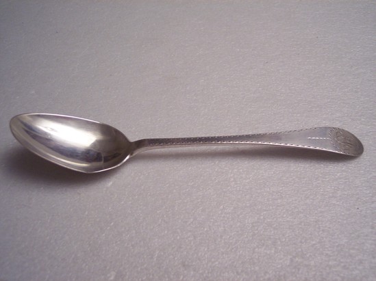 1 silver tablespoon. "JAT" in script on front of handle. Etching all along handle of spoon. "W. FORBES" in rectangle on reverse of handle. Small crack and dent around lip of bowl