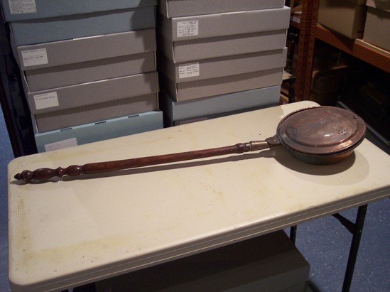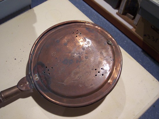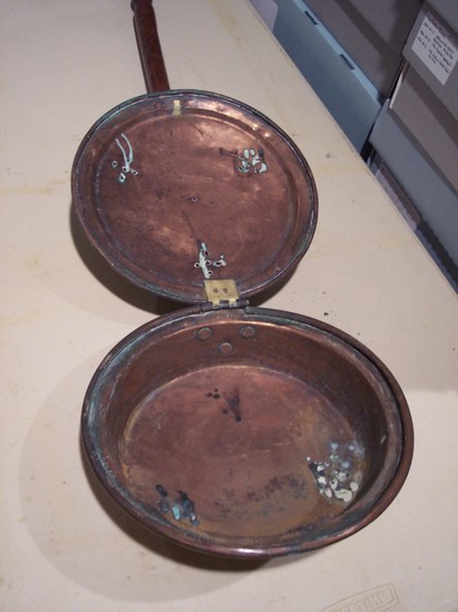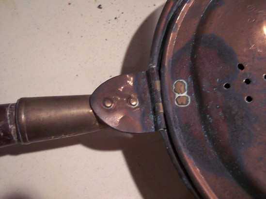 Round spun copper pan with flared sides. 3/4" rim with rolled edge. Hinged top with brass hinge with copper rivets, ring of brass opposite handle on cover. Cover rolled edge with flat domed top and three sets of five holes opposed in X form with floral engraving on top. Heavy triangular base to handle socket with arrow shaped tab to hinge on top. Plain socket with ring neck. Handle dark wood with turnings and finial.