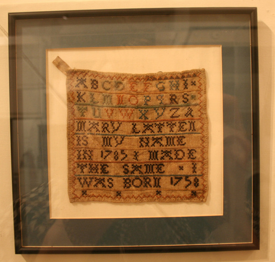 The silk threads are black, blue and russet. There are horizontal lines between each line of letters and the edge is finished with a single meander in russet thread. There is a loop of cotton sewn to left upper corner. Cross stitched in sampler "Mary Latten/Is My Name/In 1785 I Made The Same-I/Was Born 1758"