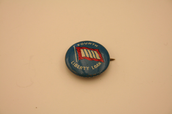 World War I era pin. Round metal button with stick pin on back. Blue enamel cover with "FOURTH/LIBERTY LOAN" in white lettering around picture of American flag.