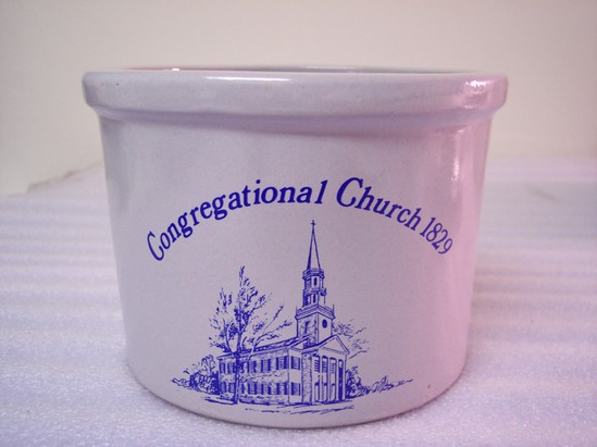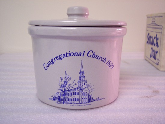 Gray glazed souvenir crock with knobbed lid. Base has depiction of a church in blue centered on one side and on that side the words, "Congregational Church 1829" in blue. Stored in original box.