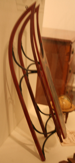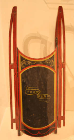 Wood sled. Either a toy or possibly manufacturer's sample. Top is flat board with concave front and convex back painted with red and black pant with yellow, black and red lining. Side panels and holds of wood cross braced at right angles. "Snow Bird" painted on face of sled in yellow. 2 Y shaped iron painted black and red lines attach curved painted runners to body - end of runner, curved up to side rails. 2 eye holes in front of runners.