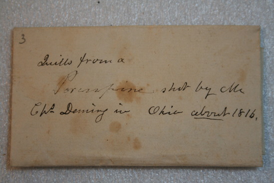 Piece of paper fold into an envelope. Written in ink on outside "Quills from a Porcupine Shot by Mr. Chs. Deming in Ohio about 1816." Fifteen porcupine quills inside.