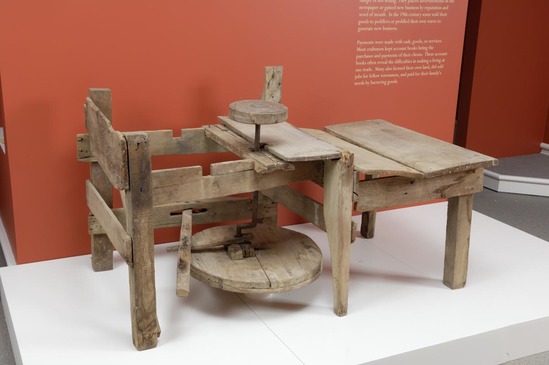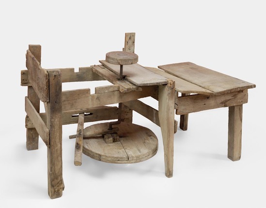 Two wooden tables, roughly attached. Treadle-operated potter's wheel on left-side table. The right-side table supposedly held 1940-09-4I, the pipe mold. Table top is make of wide planks of wood; legs are thick, square. Chair is backless, probably a windsor-style chair at one time.