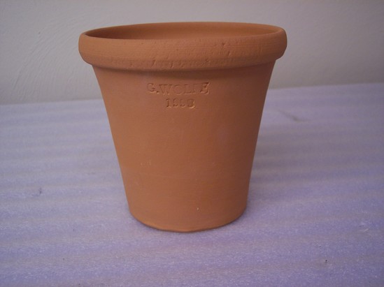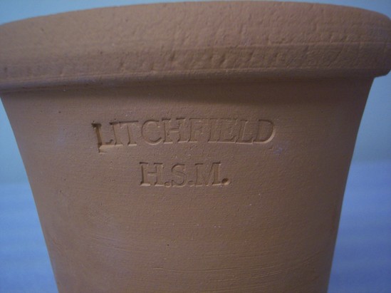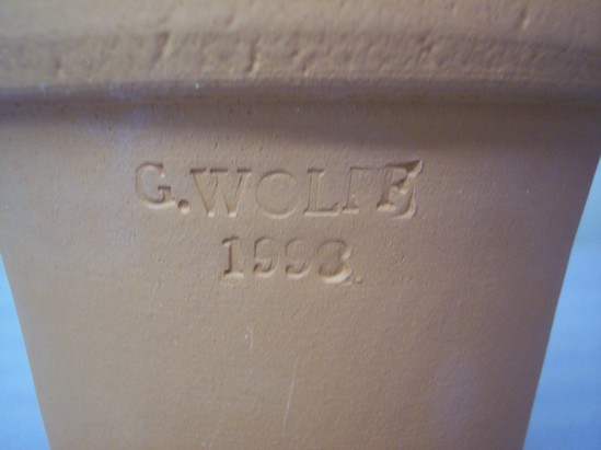 REDWARE FLOWER POT WITH SMALLER CIRCULAR BASE AND FLARING STRAIGHT SIDES, WHICH RISE TO A LARGER TOP OPENING. POT HAS DECORATIVE BAND LIP AT THE TOP EDGE EXTERIOR AND A DRAINAGE HOLE IN THE BASE. THE POT IS UNGLAZED. THERE ARE TWO INSCRIPTIONS, OPPOSITE EACH OTHER ON THE SIDES OF THE FLOWER POT. THE FIRST READS "G.WOLFF / 1998." THE SECOND INSCRIPTION READS "LITCHFIELD / H.S.M." H.S.M. STANDS FOR HISTORICAL SOCIETY MUSEUM. A SMALL SQUARE STICKER ON THE BOTTOM OF THE FLOWER POT INDICATES THAT THIS ITEM WAS MEANT FOR SALE IN THE MUSEUM GIFT SHOP. tHE STICKER READS, "P304 / 11.----" MAKER GUY WOLFF USES THE DESIGNS OF ANOTHER LOCAL POTTER, 19TH CENTURY GOSHEN, CT, POTTER HERVEY BROOKS, TO INSPIRE HIS MODERN DESIGNS.