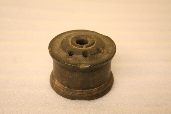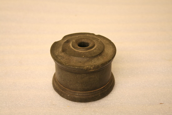 Round black basalt ink well. Large hole in center with three smaller holes on one side. Pronounced base and rim.