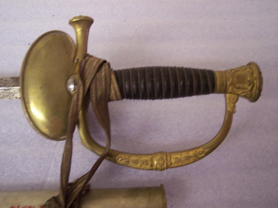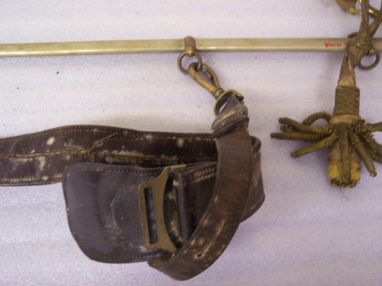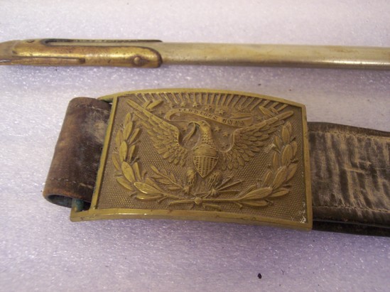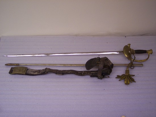 A: Sword has iron blade, diamond cross section. Brass hilt has two solid disked guards, one hinged for carrying comfort. Rigid guard has great eagle motif. Single closed knuckle bow and brass pommel with eagle and seal. Grip is wound with copper wire. Gold braid sash tied to grip. B: Scabbard is nickle based metal with brass throat and tip. Two rings for belt attachment C: Belt is black leather with square brass buckle with great eagle design. Brass clip on strip attached to belt will fasten to scabbard