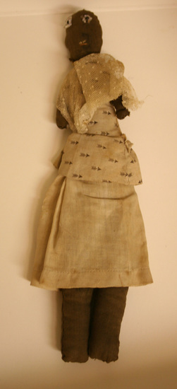 Homemade doll. Body of brown cotton, eyes are glass bead and mouth is embroidered onto cotton face. Doll is dressed in plain white cotton skirt with a frock of white cotton printed with arrows and a shawl of machine lace.