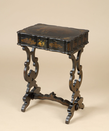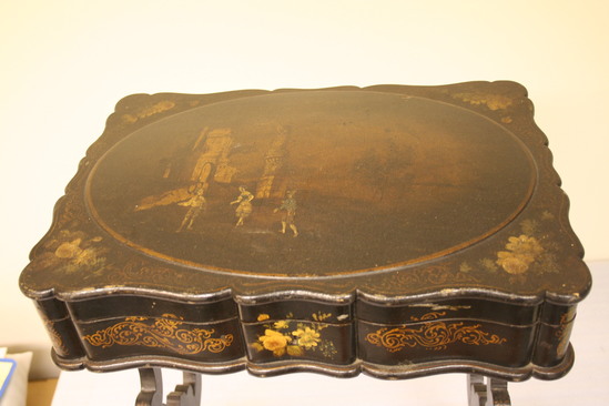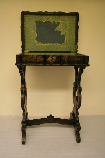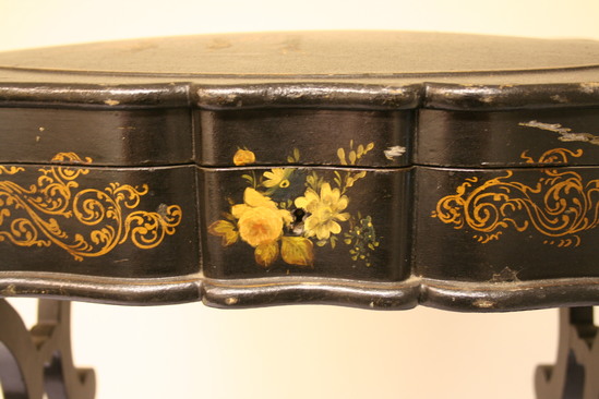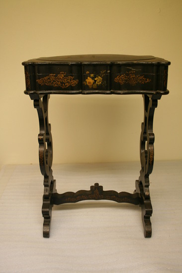 Sewing table; papier mache; rectangular box with hinged lid; edges are scalloped; center panel of box has painted flowers, sides have gold decoration; two legs, jigsawed, lyre shaped; cross bar at bottom stabilizing legs; bar has arched bottom and C curved top with fleur de lis in center. Legs and bar have gold decoration on them.