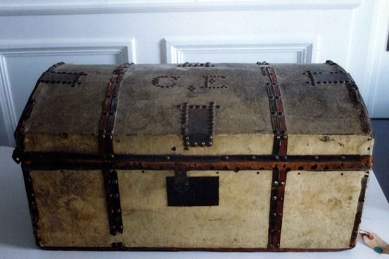Leather or hair covered wooden trunk with dome lid. Red and green leather strap decoration applied with brass tacks along edges of trunk and two straps running vertically over the trunk. Iron lock plate and handles either side of body. "G E" in brass tacks on the top of the trunk.