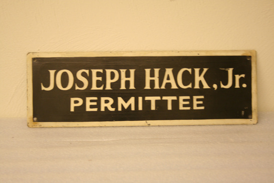 Piece of sheet metal which has been folded over 1/2" all around the sign which has small screw holes on corners presumably for fastening to wall of building. Sign first painted white which has yellowed. Stenciled in black with a 3/8" border "Joseph Hack Jr." and "Permittee" all in block lettering. On reverse side, the words "Joseph Hack" are roughly rendered in pencil between ruled lines