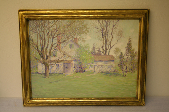 Oil on canvas landscape painting of the rear of a house in spring. Label: "Rear of 'Old Wells Place (Philip Hubbards) Spring'" Exhibited Kent. One of my favorites - A. D." The house is on East Street opposite the Litchfield Locker, south side of Bantam River.