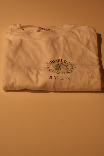 White short sleeved t-shirt. Logo on upper left hand side of shirt, printed in green. Circle logo with runners and steeple or clock tower. "Litchfield Hills Road Race" printed around outer edge of logo. "June 13, 1993" printed below logo.