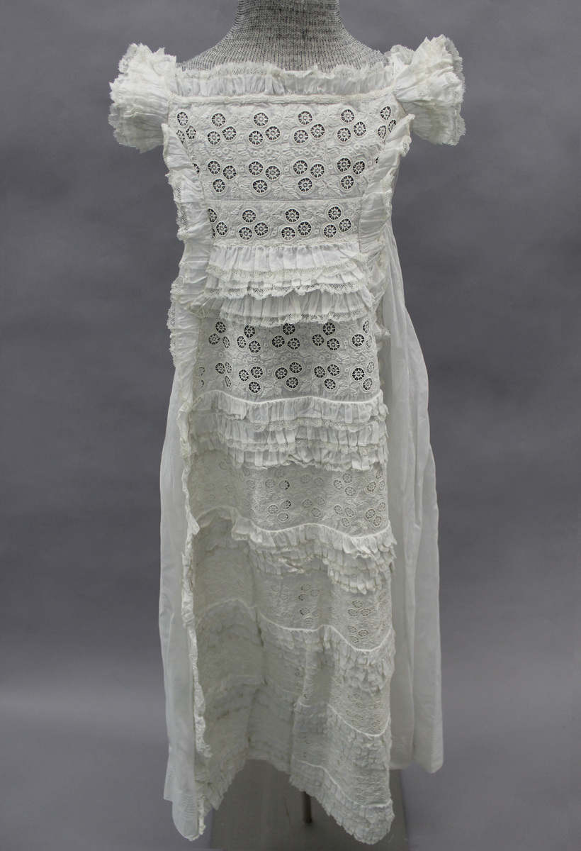 White cotton child's dress; scoop neck with lace edge; short sleeves with three ruffles and lace; embroidered bodice with needle fillings; long embroidered panel ("en tablier") down center front with ruffles; drawstrings at center back neck and waist for closure