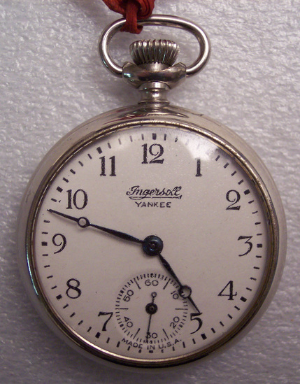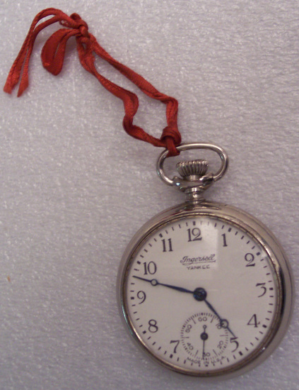 Silver watch. White enamel face with Arabic numbers around face. Underneath "12" at top of face is makers stamp "Ingersoll/Yankee" Hands are black metal. Knob at top of watch for winding, surrounded by a loop in which a red silk ribbon has been tied to watch.