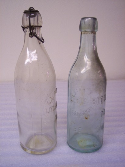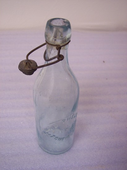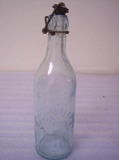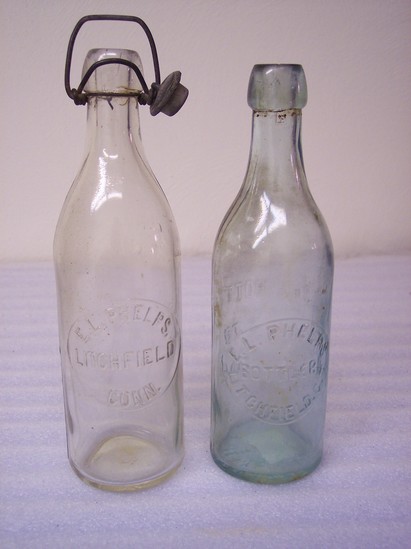 3 glass bottles - a: clear glass; b,c: aqua tinted clear glass. a/c: metal stoppers attached to necks of bottles. Impressed on one side of each bottle "E.L. Phelps/Litchfield, Conn". On back of b/c: "THIS BOTTLE NOT TO BE SOLD"