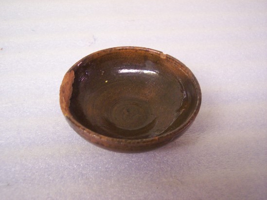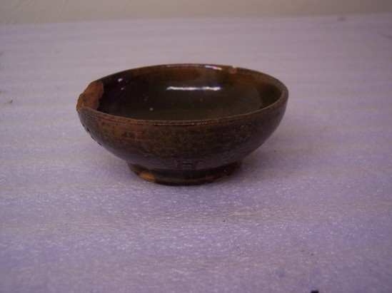 FLARES UP FROM BASE, HAS A PLAIN RIM. GLAZED INTERIOR & EXTERIOR WITH CHOCOLATE BROWN GLAZE.
