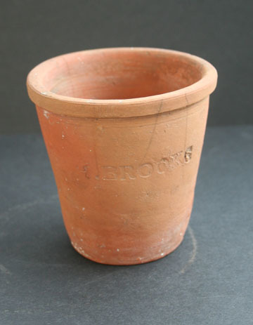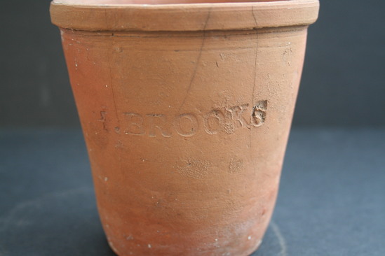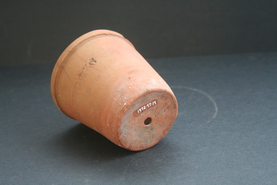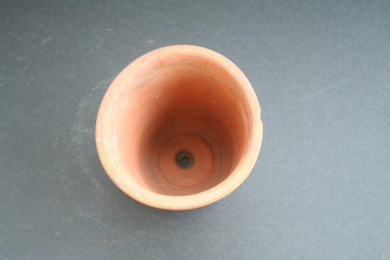 UNGLAZED REDWARE WITH TAPERING SIDES, ROLLED & SHAPED RIM, PLAIN BASE. CENTRAL DRAINAGE HOLE ON BOTTOM.