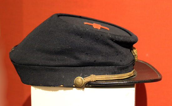 Dark blue wool cap (kepi); flat top tilted forward with Red Cross sewn in center; short, flat, black visor in front with gold band attached with two gold eagle designed buttons running along hat at base of visor; front, center of hat - a gold cord emblem with "U.S." in center; black band and black silk lining inside