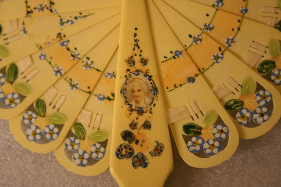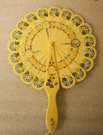 Round fan made of petal shaped sticks of ivory with openwork ends with three white flowers outlined in blue. Silk ribbon woven through top of each stick. Inner circle painted peach to match ribbon with small flowers and four circular miniatures in watercolor on paper of French court ladies in powdered wigs.
