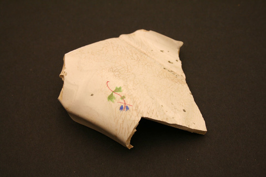 Piece of ceramic; possibly part of a jar or large bowl; design of small blue bud with red stem and green leaves on one side