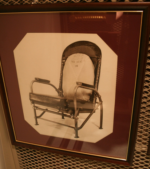 Vertical black and white photograph of the side view of an airplane seat. Airplane seat cover is labeled "August 1940 28" Framed under glass with a maroon mat board and wooden frame with a gold line on interior edge.