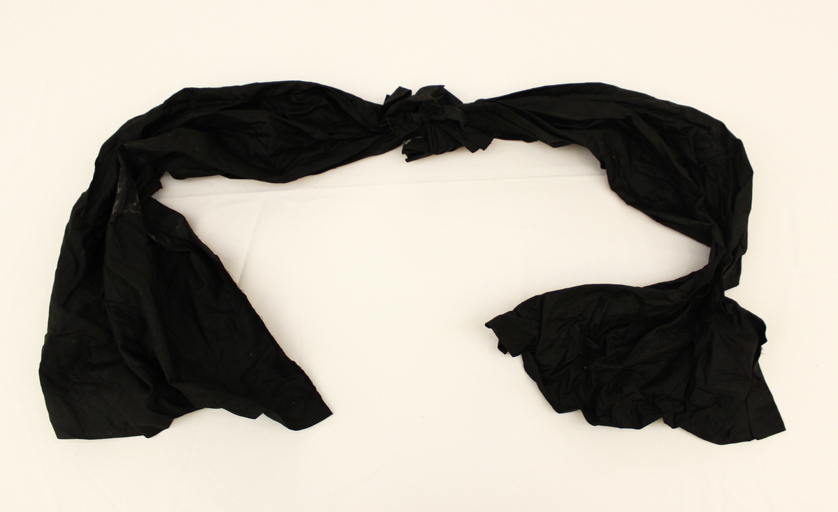 Black swag - gathered in center. Also gathered at one point on one side (held together with pin at this point). Bow tied in center where feathered. Ribbon used for bow similar to 2005-20-6. Swag has unfinished edges that have begun to unravel - never seamed. Would have been displayed in mourning.