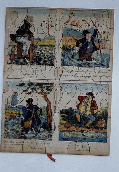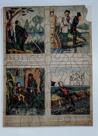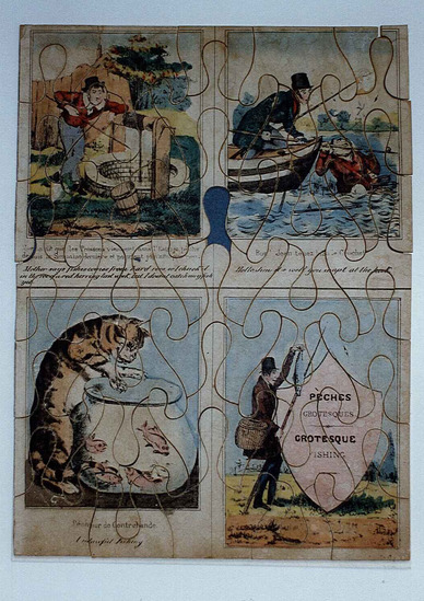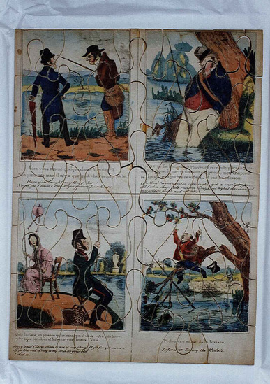 4 puzzles, part of a set entitled "Peches Grotesques / Grotesque Fishing" each hand-colored paper on wood puzzle has a series of four cartoons depicting various men attempting different methods and encountering different disasters in fishing, each cartoon has a caption below written first in French and then in English below. A great child's learning tool for teaching French.