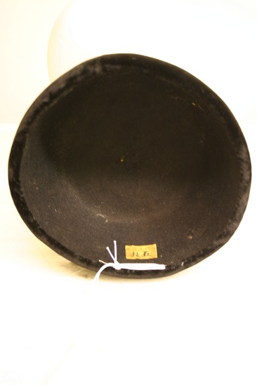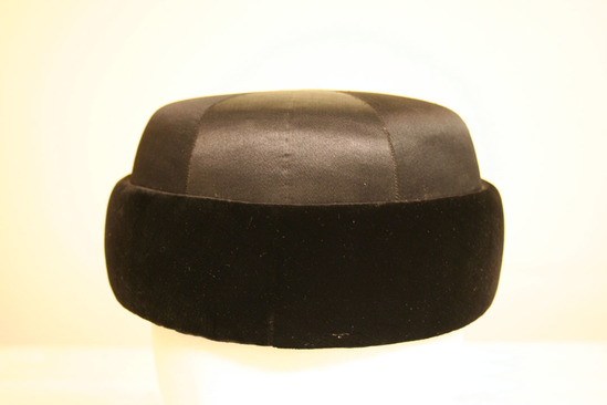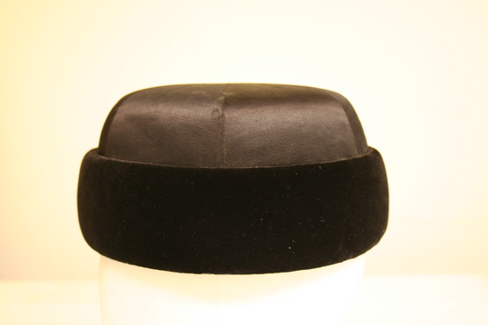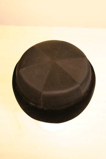 Circular cap; all black; wide velvet trim 2 1/2" high; crown covered in black satin cut into pie shapes meeting at top; black felt interior; 1" square tag with red and black chinese characters