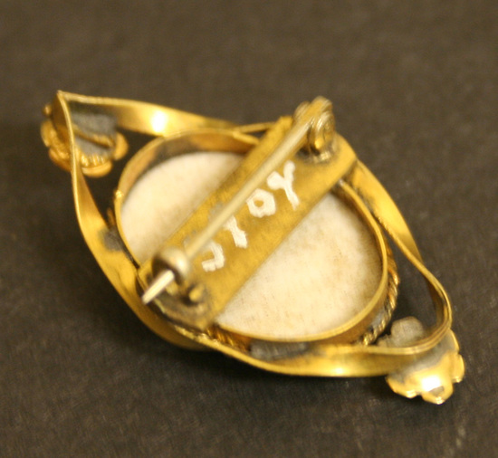 Oval shaped brooch. Prominent gold setting with shaped flowers at top and bottom. Stretched twist of gold around outside of oval setting. Watercolor image set in brooch of young girl in green dress, curled hair, head turned to the left