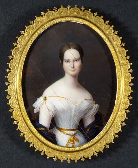 Full face, 3/4 length. Dark brown background. Brown hair parted in center down under ears; blue eyes. Empire style formal white dress with gold ribbon trim at bust and green pin fastened sleeve. Gold ribbon on waist doubled around waist and tied in front. Purple robe with gold edge. Frame is gold metal; Gothic fleur-de-lis design.