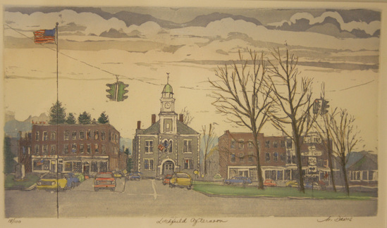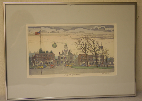 Depicts scene of West Street shops from across the Green. American flag in front, left foreground, traffic light, highway signs, cars. Trees have no leaves but grass is green. Framed under plexi, light blue mat, silver metal frame.