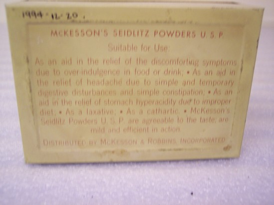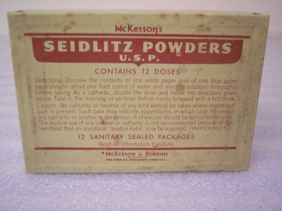 Empty rectangular metal box painted buff with rust colored lettering "McKesson's Seidlitz Powders/U.S.P./Manufactured by McKesson & Robbins Inc./New York, NY or Bridgeport, Conn."