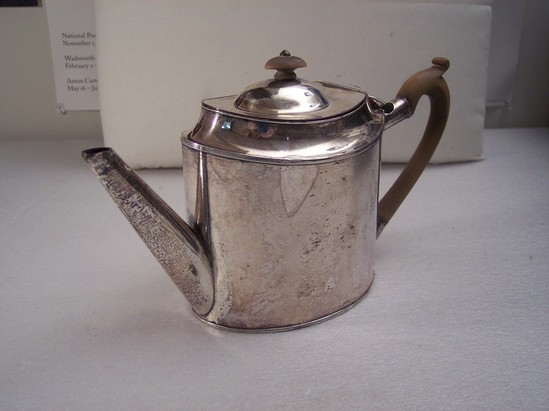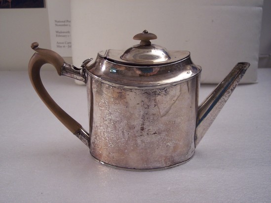 Plain oval body with straight oval spout riveted near base with shaped fruit wood handle opposite set in silver mounts top and bottom. Top has a deep molding with a domed lid hinged at one end and has an ova fruit wood finial attached with winged nut underneath. Top and bottom edges finished with three delicate lines. The sides are double walled for hot water which was filled by pouring in opening covered by hinged cover on top handle mount. Used for gravy or thick sauces. The hot water kept them warm enough to pour.