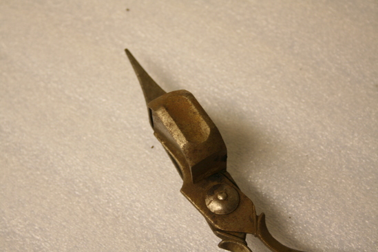 Three peg feet with rounded ends inserted into scissor handles and at base of polished end; pleasant curve where scissors join blade.