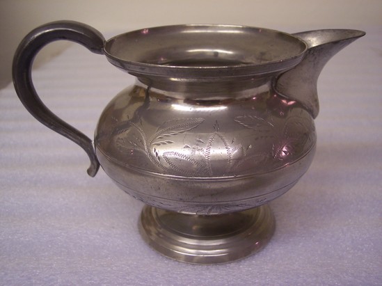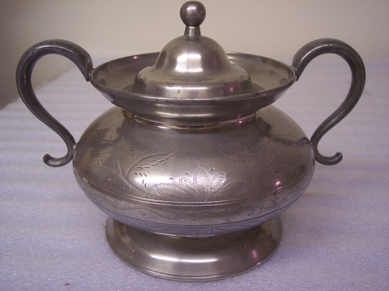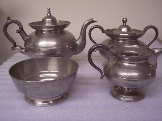 A. waste bowl; B. creamer; C,D. Sugar Bowl, w/cover; E. Teapot Touches on teapot and sugar bowl "X" above a circle