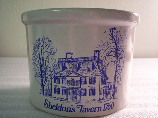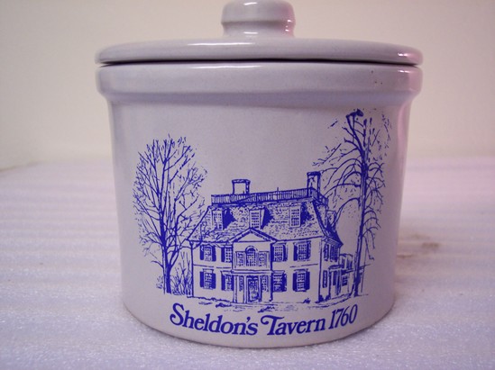 Gray glazed crock depicting a tavern in blue with the words, "Sheldon's Tavern 1760" centered on one side. Stored in original box.