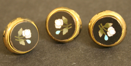 3 shirt studs. White rose design of inlaid polished stone in black enamel. Thick gold collar setting with raised round stud on back.