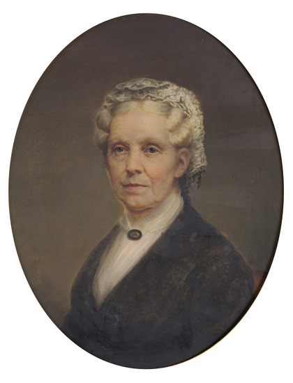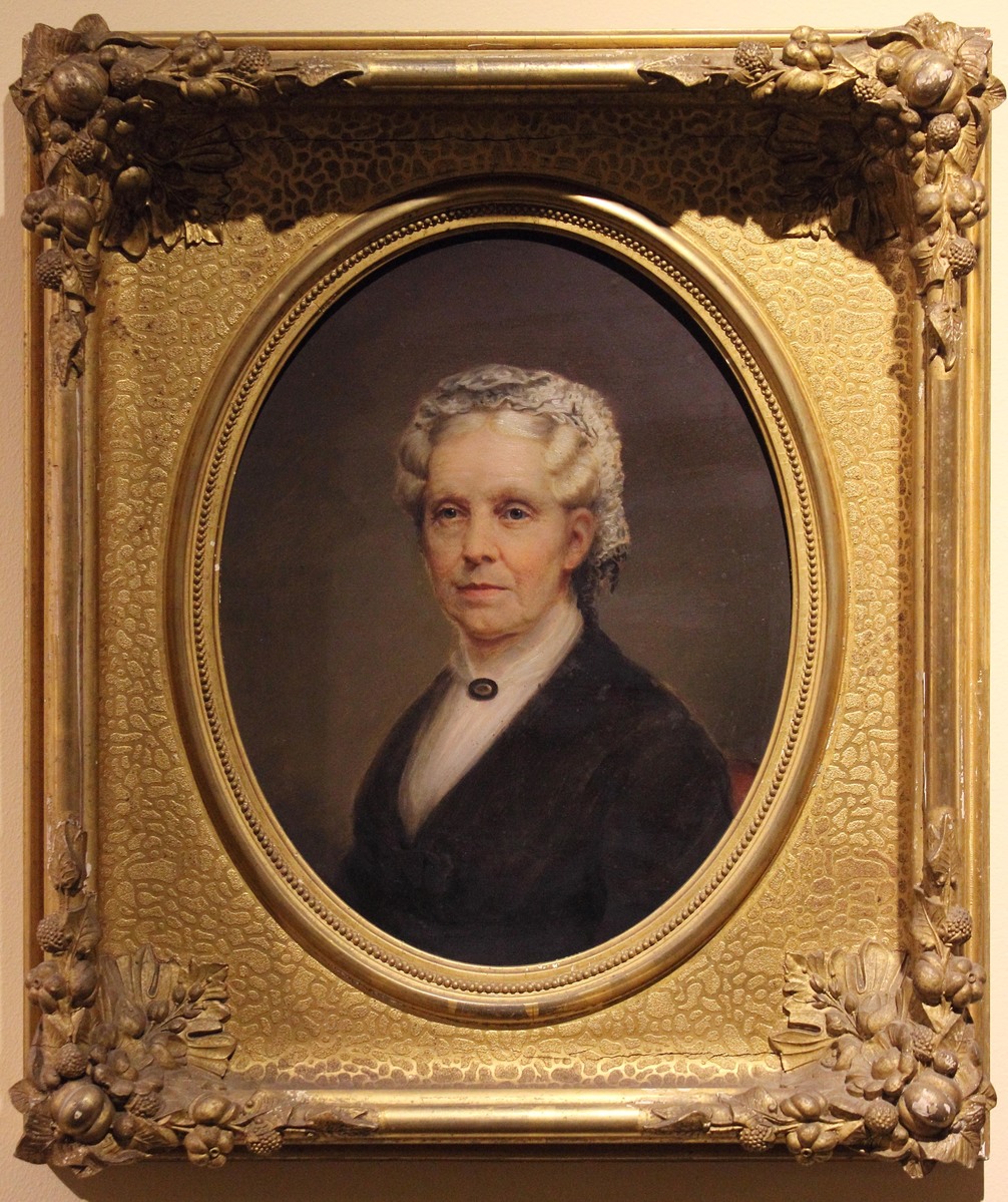 Oil on cardboard portrait of Mrs. Origen Storrs Seymour (Lucy Morris Woodruff)(1807-1894). Rectangular painting set within an ornate gilt rectangular frame with oval opening. A bust portrait of an older woman, facing left. Wavy gray hair with lace cap, brown eyes, wearing a black dress with white fichu and brown oval pin at throat. See 1918-06-1 for the portrait of Mr. Origin Storrs Seymour (1804-1881). Painted over a photo.