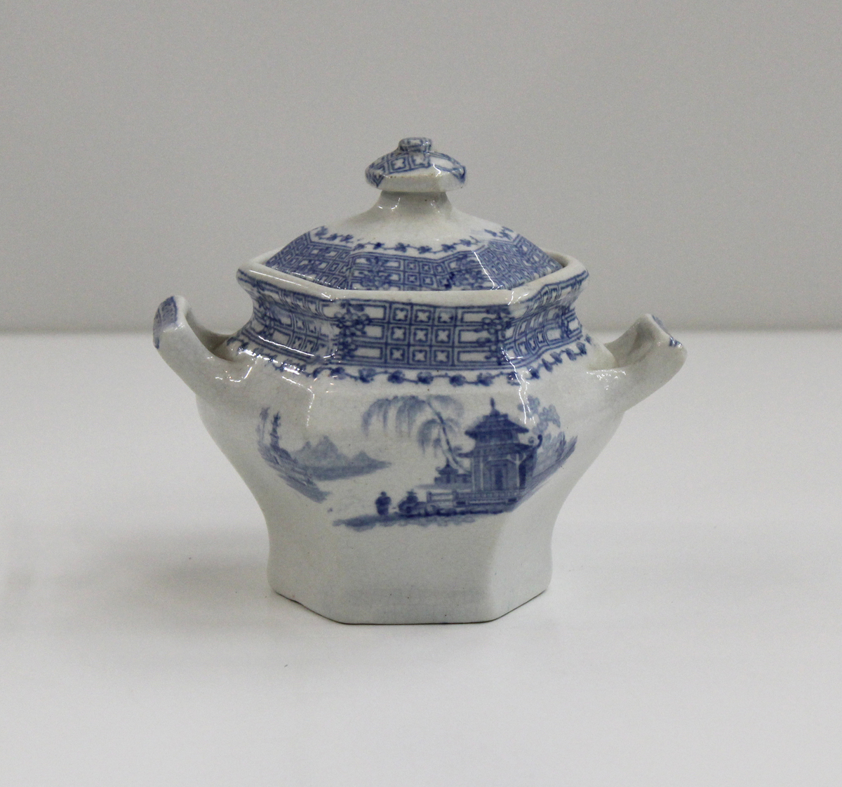 Glazed earthenware sugar bowl used as a toy or play teaware. Matches teacups (2016-52-25 a-f) and cream pitcher (2016-52-26). A - White ceramic sugar bowl with blue transfer-printed decoration and two small, square handles. Hexagonal base and opening at top. Identical Asian-inspired scenes on either side extending above the should region, depicting two figures standing in the foreground with two pagodas in the background. Lattice and floral patterns around top rim, with lattice motifs on handles. Marked "42" on bottom. B - White ceramic lid with transfer-printed decoration. Hexagonal lid with small hexagonal knob. Lattice and floral patterns around rim with lattice motif on knob.
