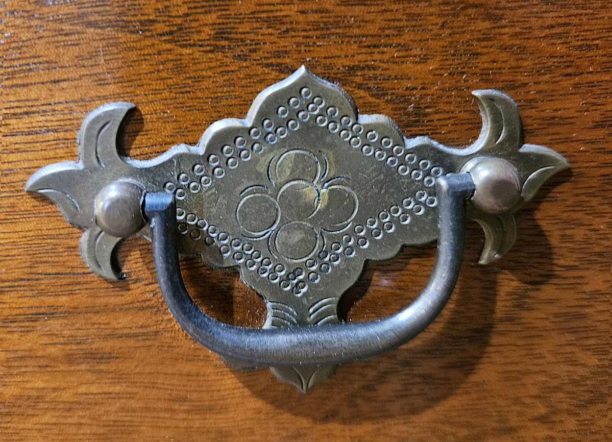 Queen Anne style lowboy. Heavy cabriole legs ending in pad feet. Full-length drawer over three side-by-side drawers, the center with carved fan. Shaped apron with acorn drop finials. Moulded overhanding top. Engraved escutcheons (William & Mary style) with bail handles; central escutcheon on top drawer has keyhole. Rounded pull below carved fan. Walnut with white pine as secondary wood.