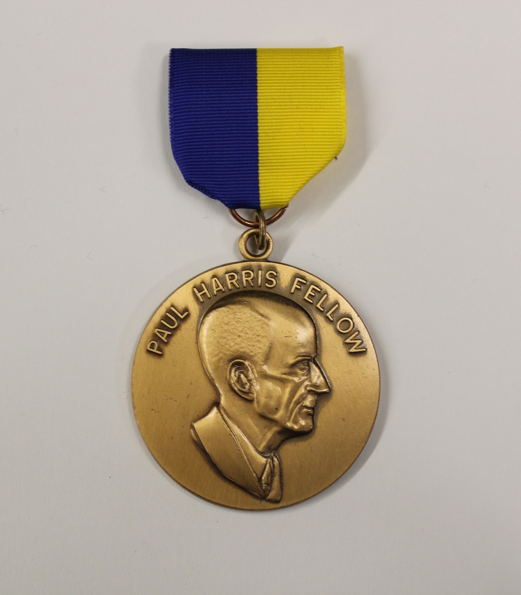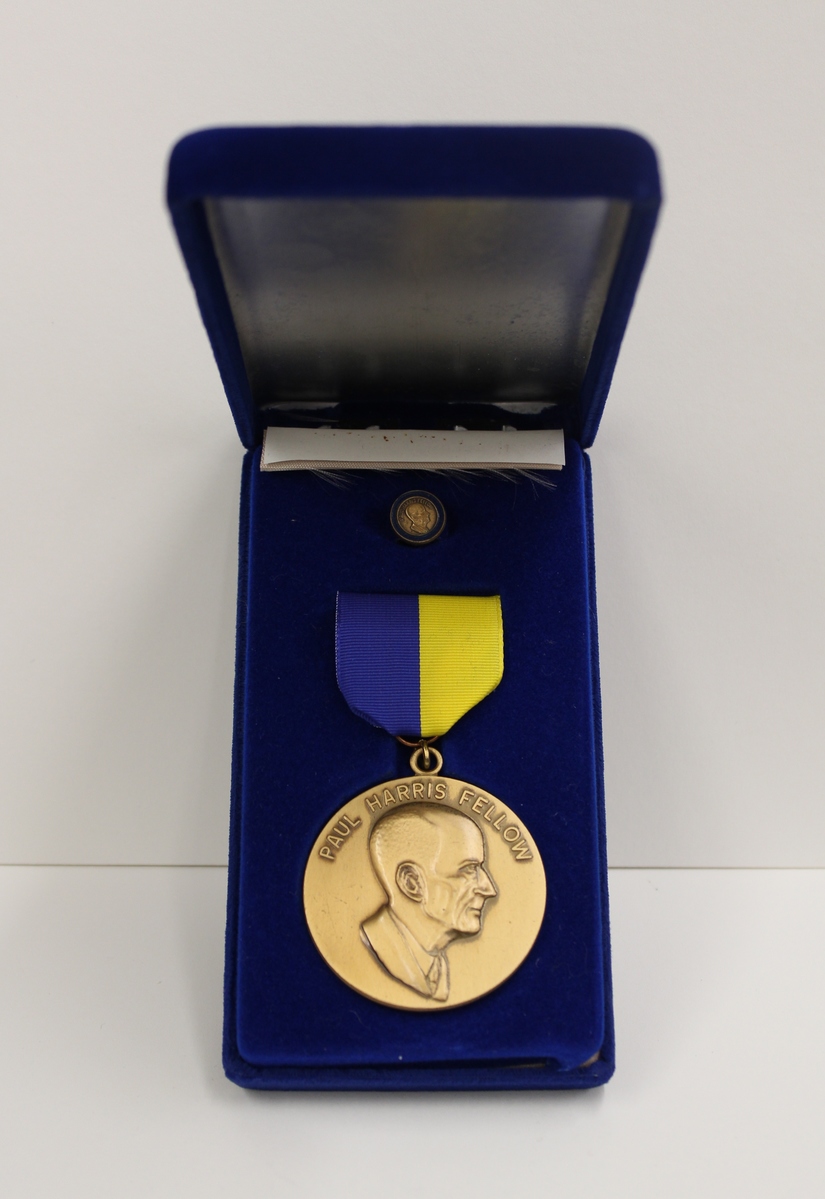 Paul Harris Fellow award from the Rotary Foundation of Rotary International, awarded to Margery Boyd. A - Circular bronze medal with blue and yellow medal ribbon. Medal obverse features raised likeness of Paul Harris with raised lettering "PAUL HARRIS FELLOW." Reverse features logo of Rotary International with raised lettering "THE ROTARY FOUNDATION OF ROTARY INTERNATIONAL." 2.125" diameter medal with 1.5" ribbon. B - Circular blue enamel and bronze lapel pin, featuring likeness of Paul Harris and raised text "PAUL HARRIS FELLOW." 0.5" diameter. C - Blue velvet, rectangular keepsake box. Silk lining on bottom with blue velvet-covered plastic insert with impressions for medal and lapel pin. Box constructed from tin, with hinged lid. 3.25" wide x 6" long x 1.125" deep.