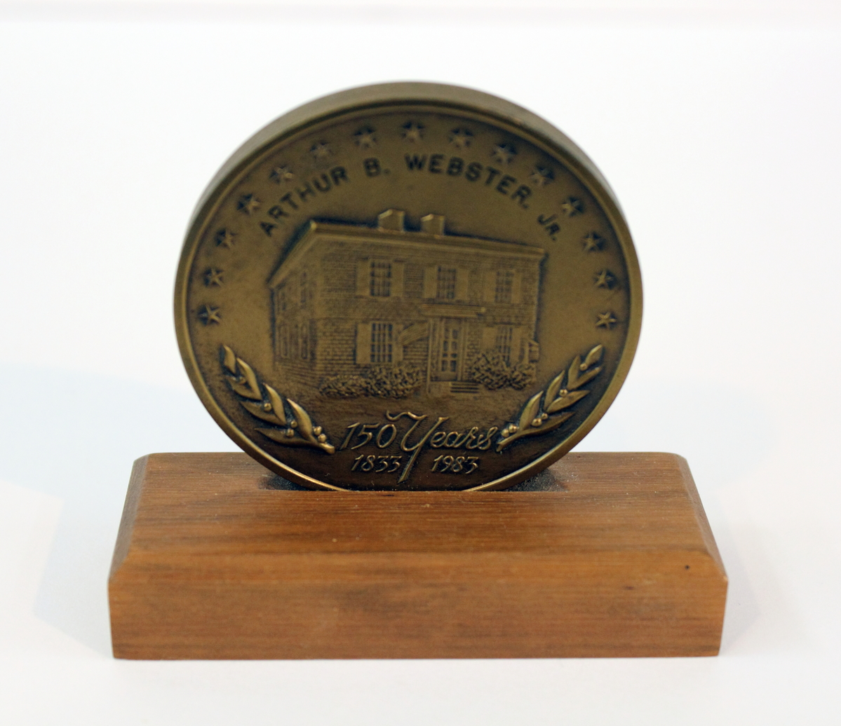 Award metal and stand given to Art Webster by the Litchfield Mutual Fire Insurance Company. Circular bronze (or bronze-colored) medal set in rectangular wooden base. Obverse of medal shows central image of a firefighter using a speaking trumpet to signal a building fire in the distance. Embossed text set in ring around image, "LITCHFIELD MUTUAL FIRE INSURANCE COMPANY." On reverse, central image of the company's building of 21 South Street, with two wheat motifs flanking text "150 Years/1833/1983"; at top, strand of 15 stars above text "ARTHUR B. WEBSTER, JR."