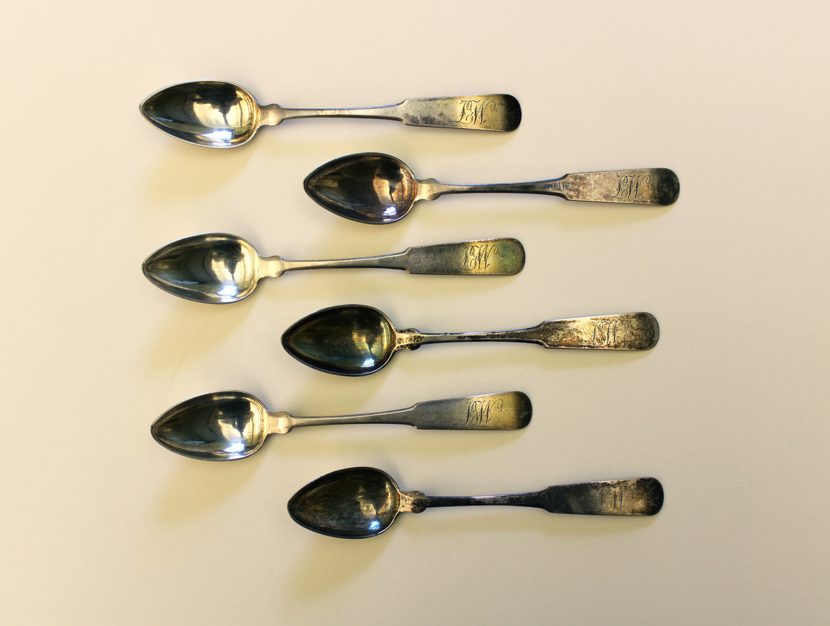 Set of six matching teaspoons made by Reuben Merriman for Lavinia Hosford Woodruff, Litchfield, Connecticut. Silver teaspoons with pointed oval bowl, rounded shoulder, and straight stem widening at handle with rounded tip. Script monogram engraved on each handle, "LW." Maker's mark stamped on reverse of each spoon, "RM," where handle meets stem.