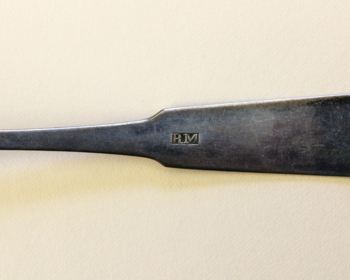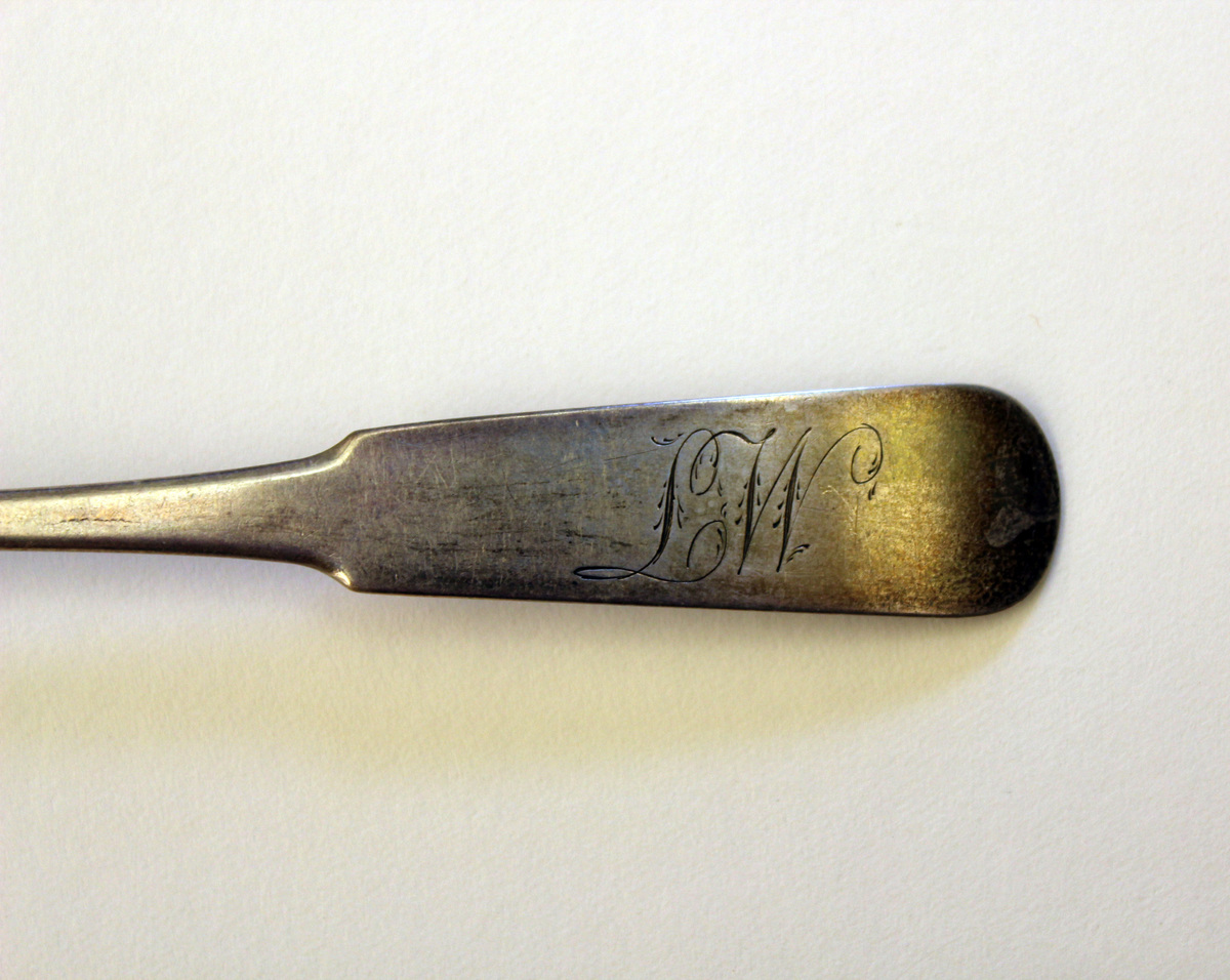 Spoons accompanied by a handwritten note confirming the owners and maker. The note dates the spoons to 1805-1810; however, Lavinia was born in 1802 and Merriman did not start working in Litchfield until 1827, so they were likely made closer to 1830. In addition to silversmithing, he worked as a clock and watchmaker and jeweler.
