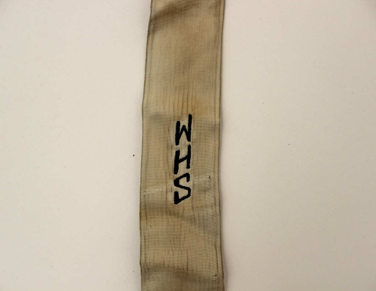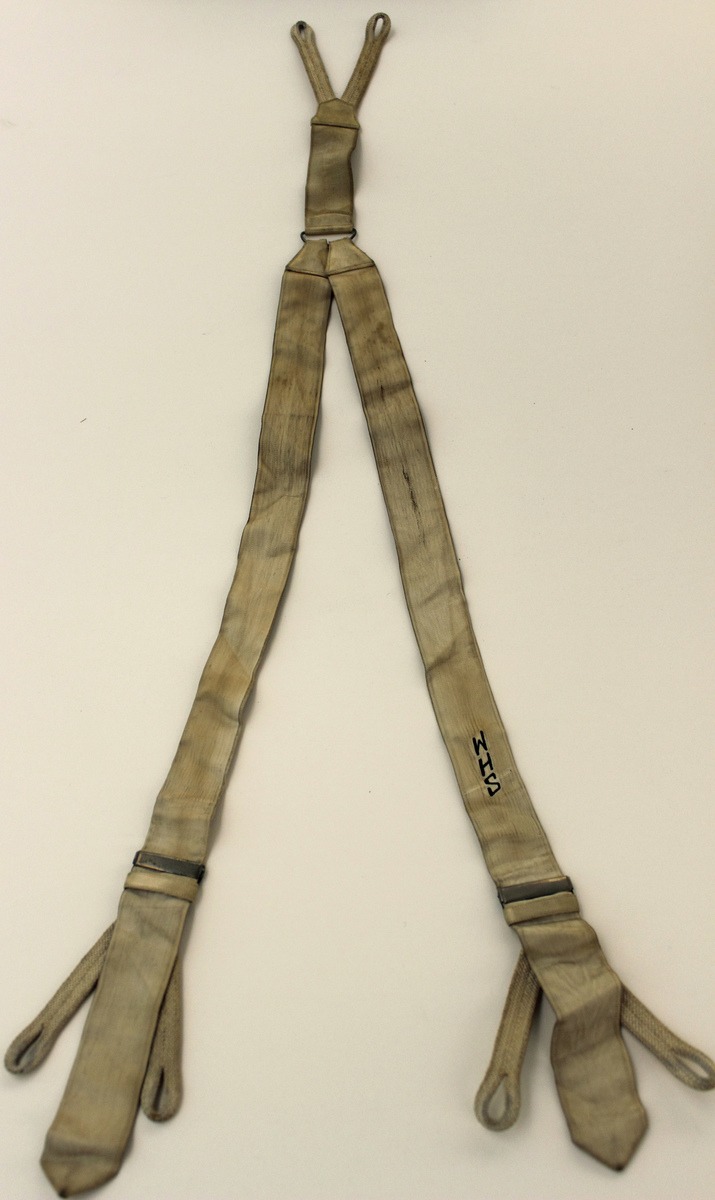 Off-white moire men's suspenders. Braided straps for buttoning to trousers. Adjustable bar for sizing. Elastic at center-back. "W/H/S" embroidered monogram in black thread on left strap.