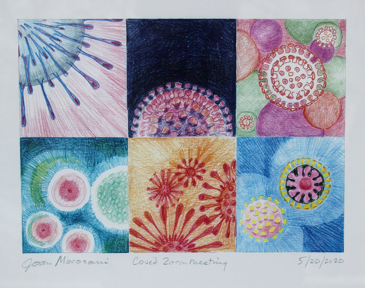 Composition of six squares, three over three. In each square is an abstract design featuring variations of COVID-19 particles, in various colors. Intended to resemble the layout of a Zoom meeting (virtual meeting software).