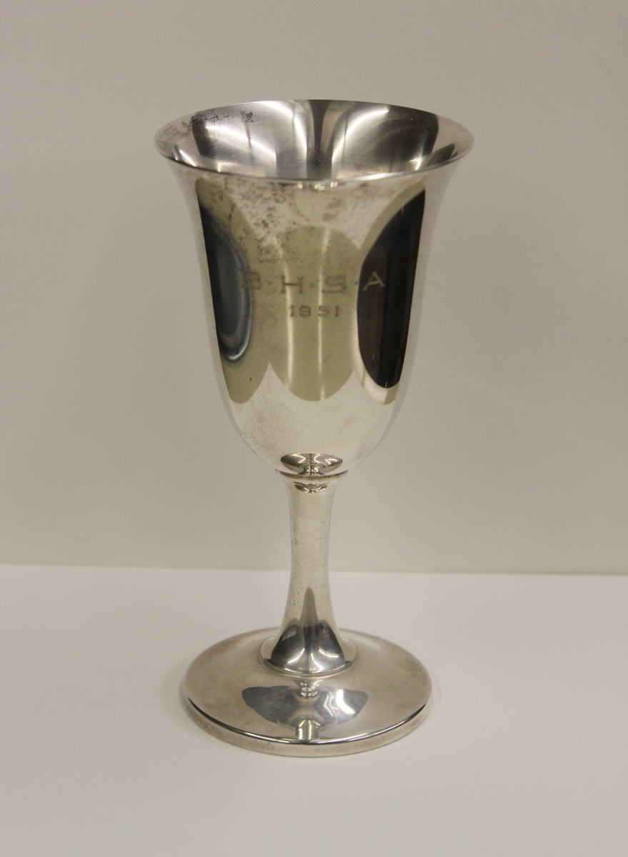 Sterling silver goblet-style trophy awarded for individual class competition at the Bethlehem Horse Show in 1951. Engraved on front "B.H.S.A./1951." Engraved on bottom "WALLACE/STERLING/14."