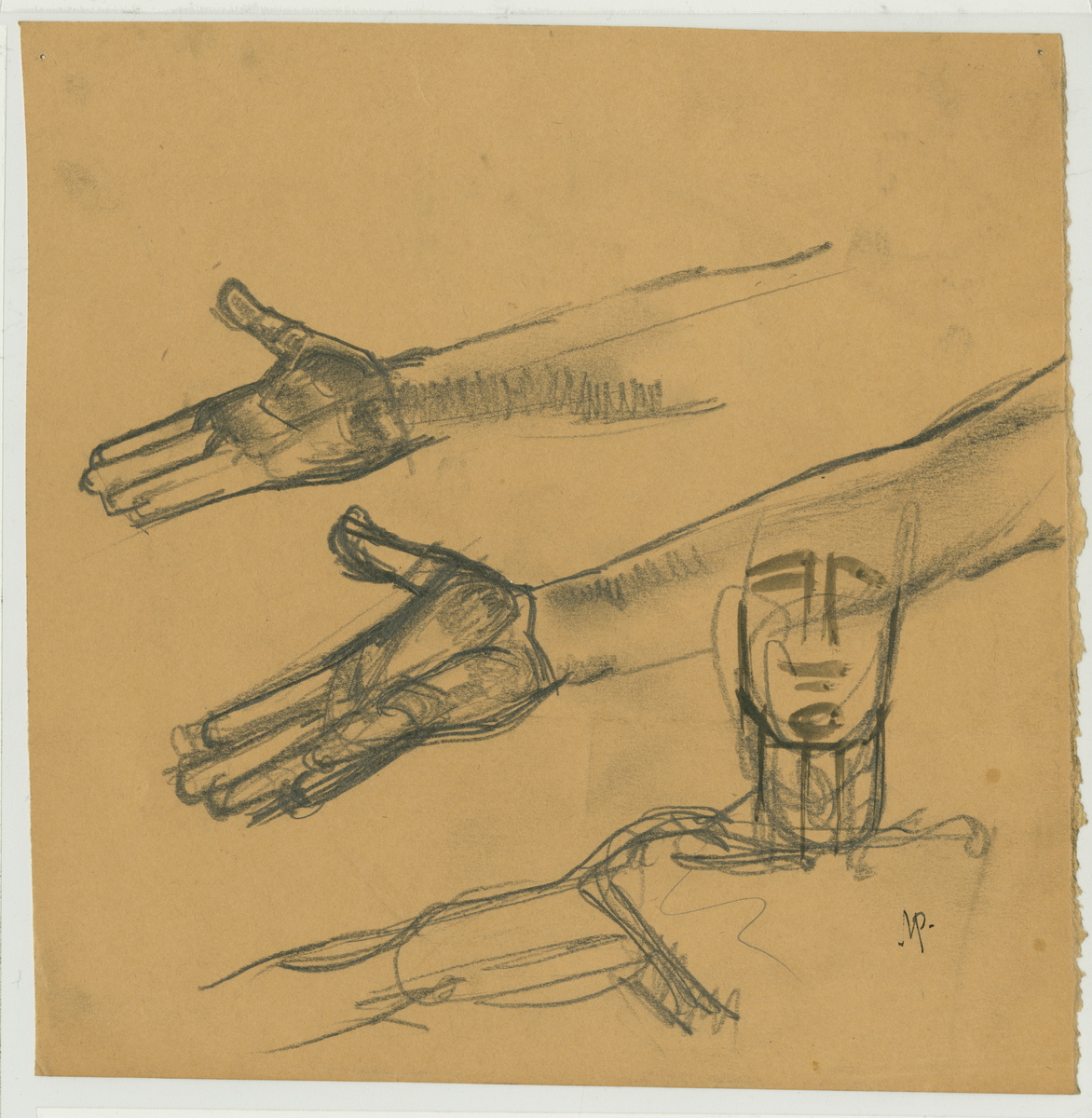 Charcoal sketch of two right hands and head with upper torso and right forearm. On the back is written in ink: "Honesdale/Austin Purves, Jr." Initialed on bottom right hand corner, no date.